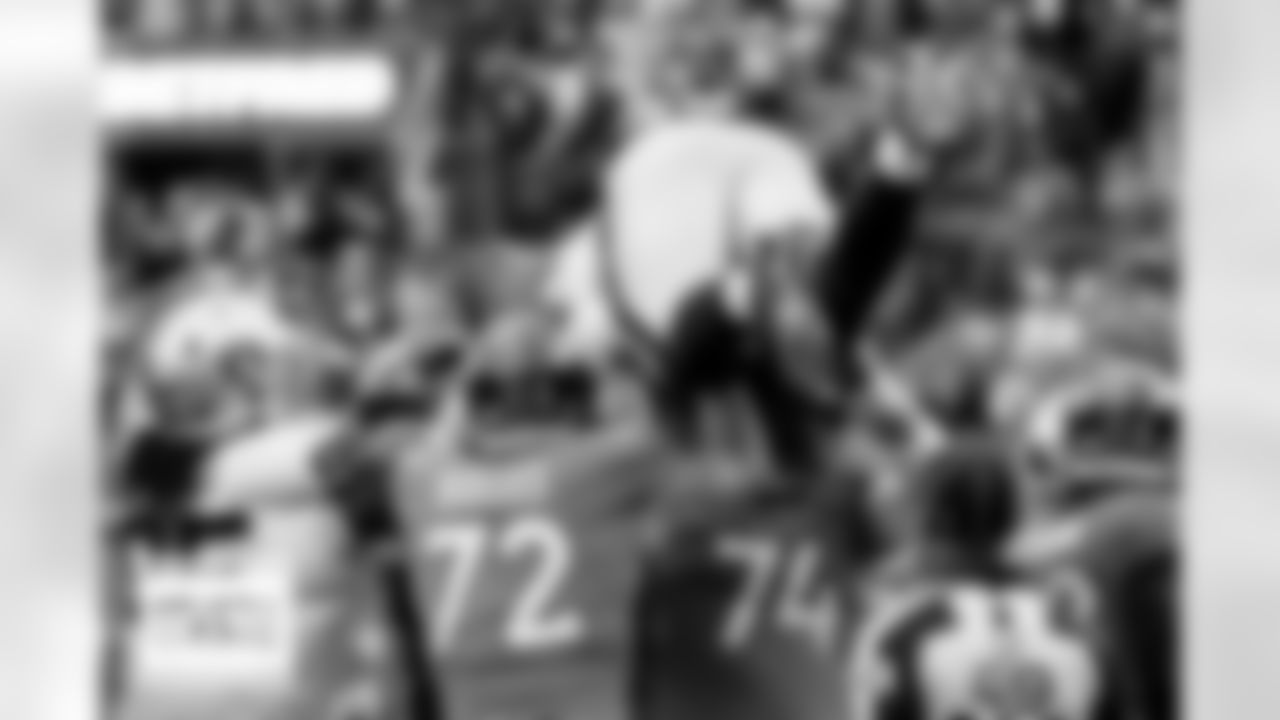 Denver Broncos offensive tackle Garett Bolles (72) and guard Ben Powers (74) pick up a Raiders player after a PAT field goal during the Broncos' Week 1 game against the Las Vegas Raiders at Empower Field at Mile High in Denver, Colorado on September 10, 2023. Photo by Ben Swanson / Denver Broncos