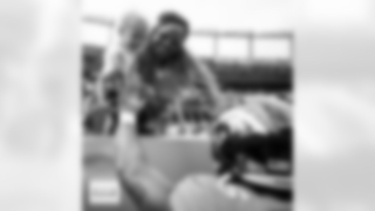 Samaje Perine greets his son before the Broncos' Week 1 game against the Las Vegas Raiders at Empower Field at Mile High in Denver, Colorado on September 10, 2023. Photo by Ben Swanson / Denver Broncos