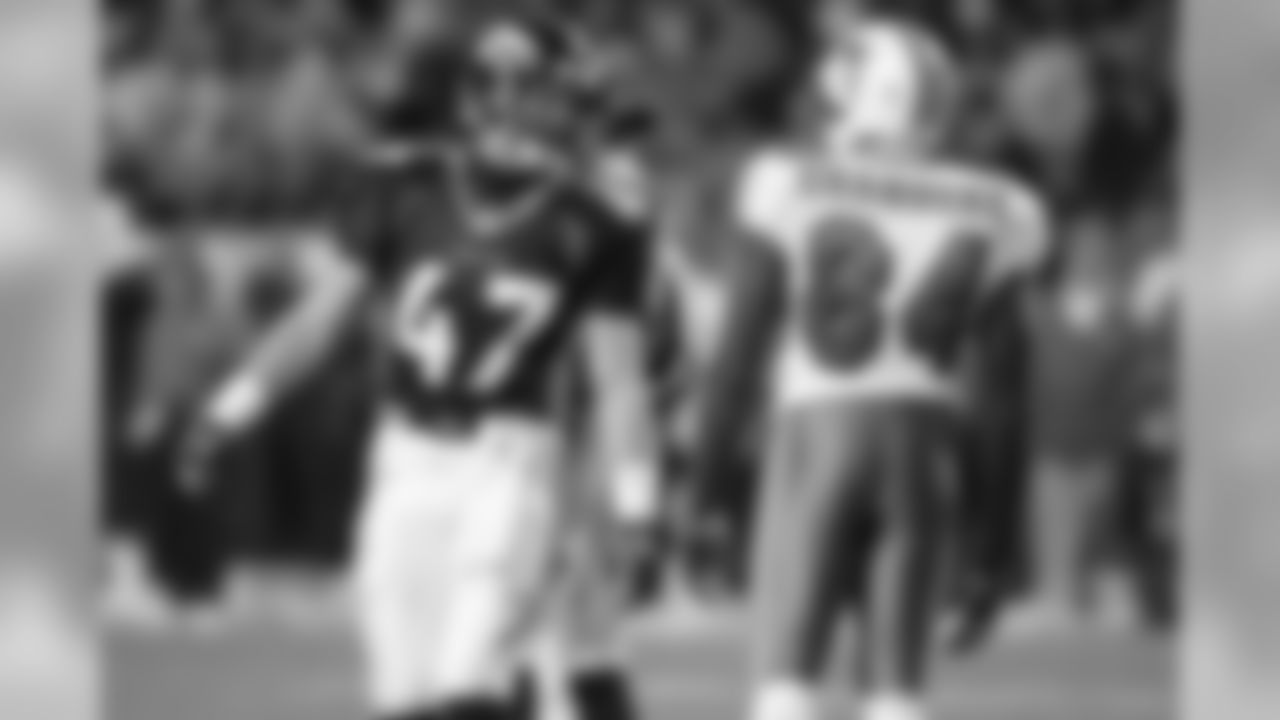 Bill Romanowski celebrates after intercepting a Dan Marino pass against the Miami Dolphins at Mile High Stadium in Denver, CO on January 9, 1999.